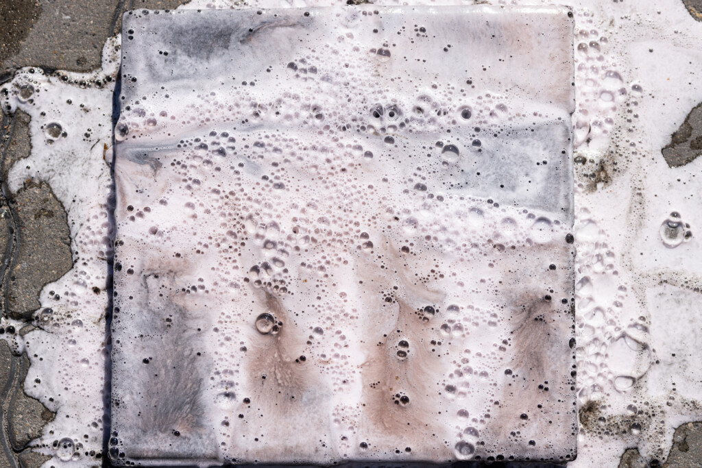 Radušās baltās putas, tīrīšanas līdzekli uzklājot uz mitras virsmas.