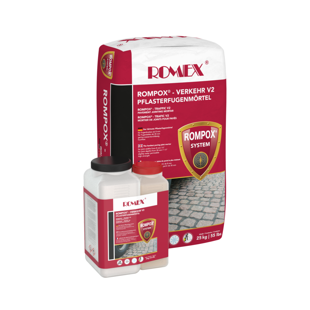 ROMPOX® - TRAFFIC V2 ir izturīgākais ROMEX® bruģa seguma šuvju aizpildītājs lielām satiksmes slodzēm publiskajā sektorā. V2 tiek izmantots, lai izveidotu jaunus savienojumus ceļu un laukumu būvniecībā, kas pakļauti lielām slodzēm.