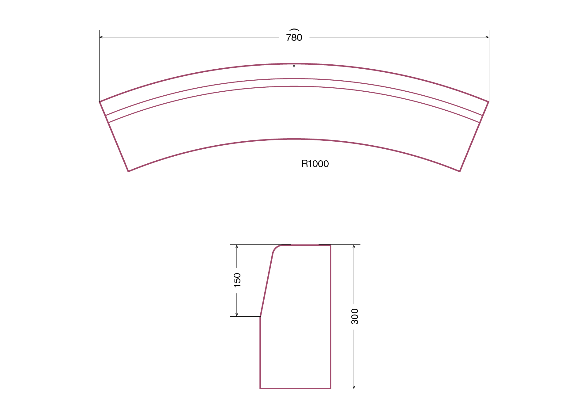 Liektas forma apmale. Izliekuma rādiuss 1000 mm.