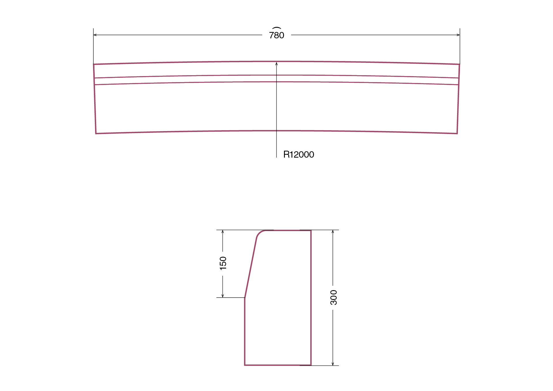 Izliekta apmale ietves malas veidošanai līknē. Lieces rādiuss 12000 mm.