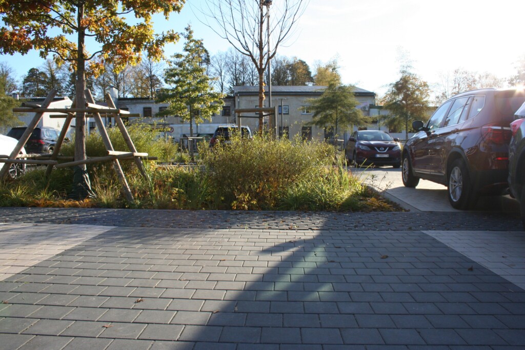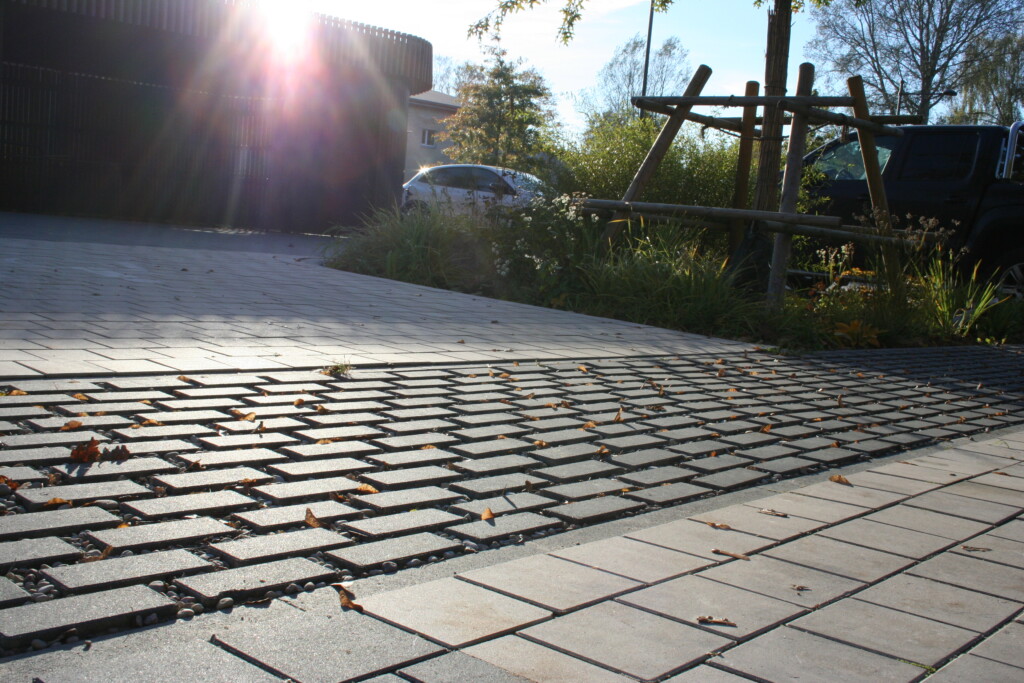 Infiltrācija un Nodalīšana: Starp divām auto novietņu rindām veidota nodaloša, lineāra josla, kurā izmantots Eco Line bruģis melnā tonī. Šī risinājuma brīvās atstarpes aizpildītas ar granīta šķembām, nodrošinot gan vizuālu nodalīšanu, gan labu ūdens infiltrāciju segumā.