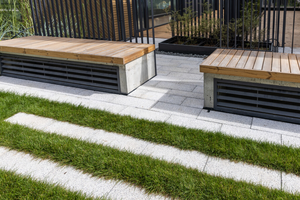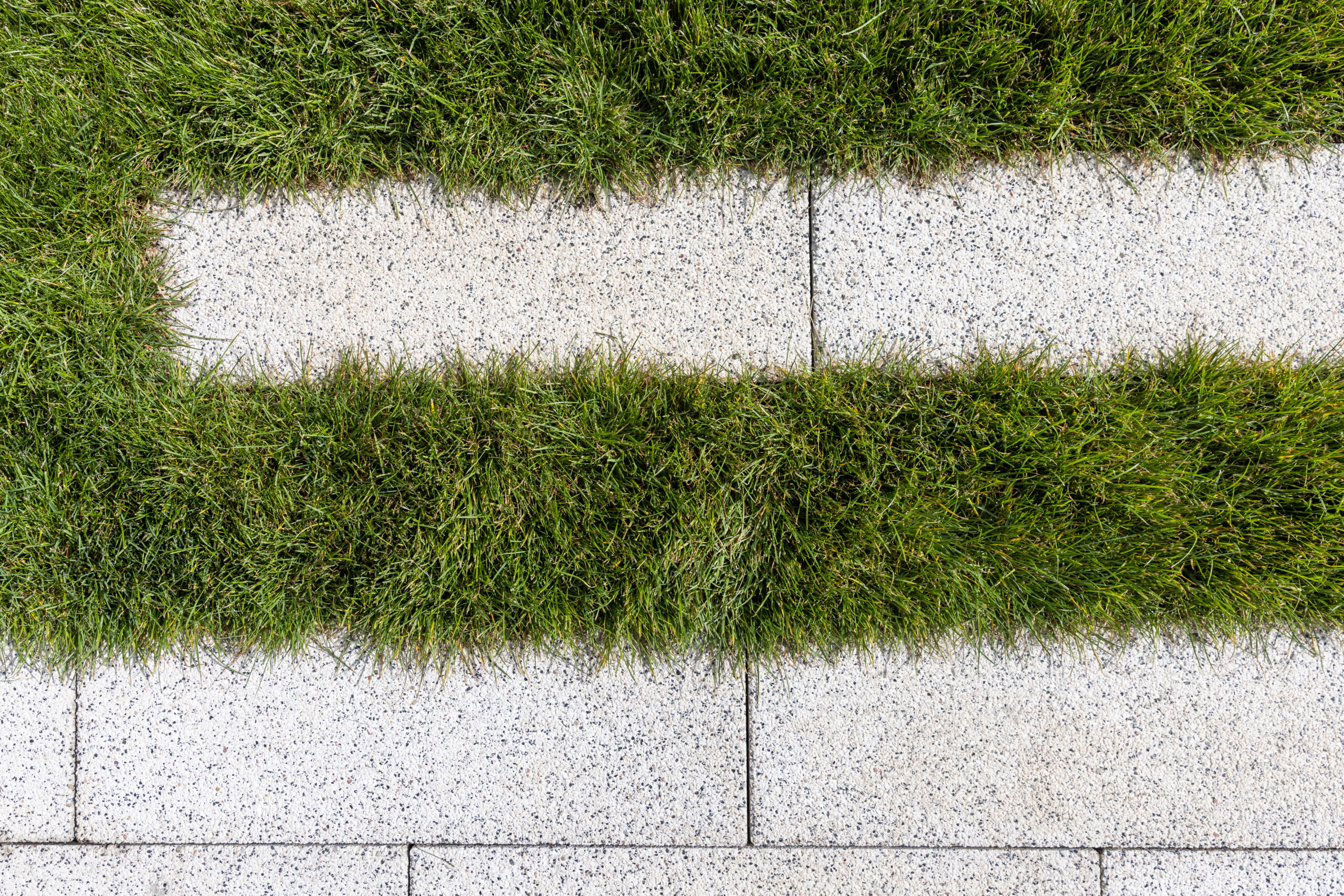 Projektā izmantotie izstrādājumi ir Plaza 6×2 plāksnes, kas pārklātas ar dabīgā akmens faktūru Quartz. Netradicionālais bruģis rada mājīgu un funkcionālu zonu, bet bruģēšanas veids un izstrādājumu daudzums liecina par paredzēto funkcionalitāti – vai tas būtu tikai celiņš, pa kuru iet, vieta, kur apsēsties , vieta, kur apstāties un aprunāties ar kaimiņu, vai vienkārši vieta, kur vērot rotaļu laukumā rosīgos bērnus.