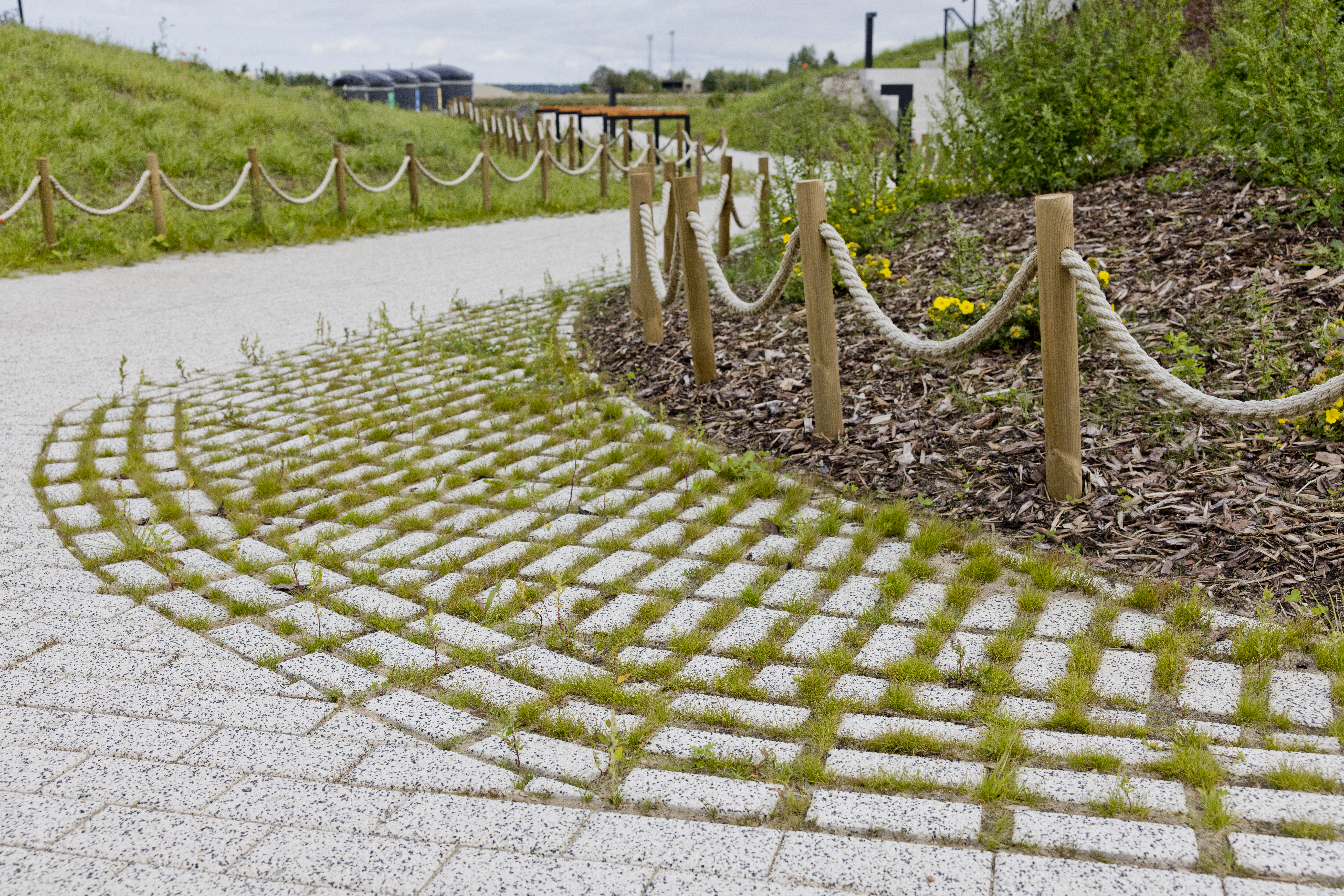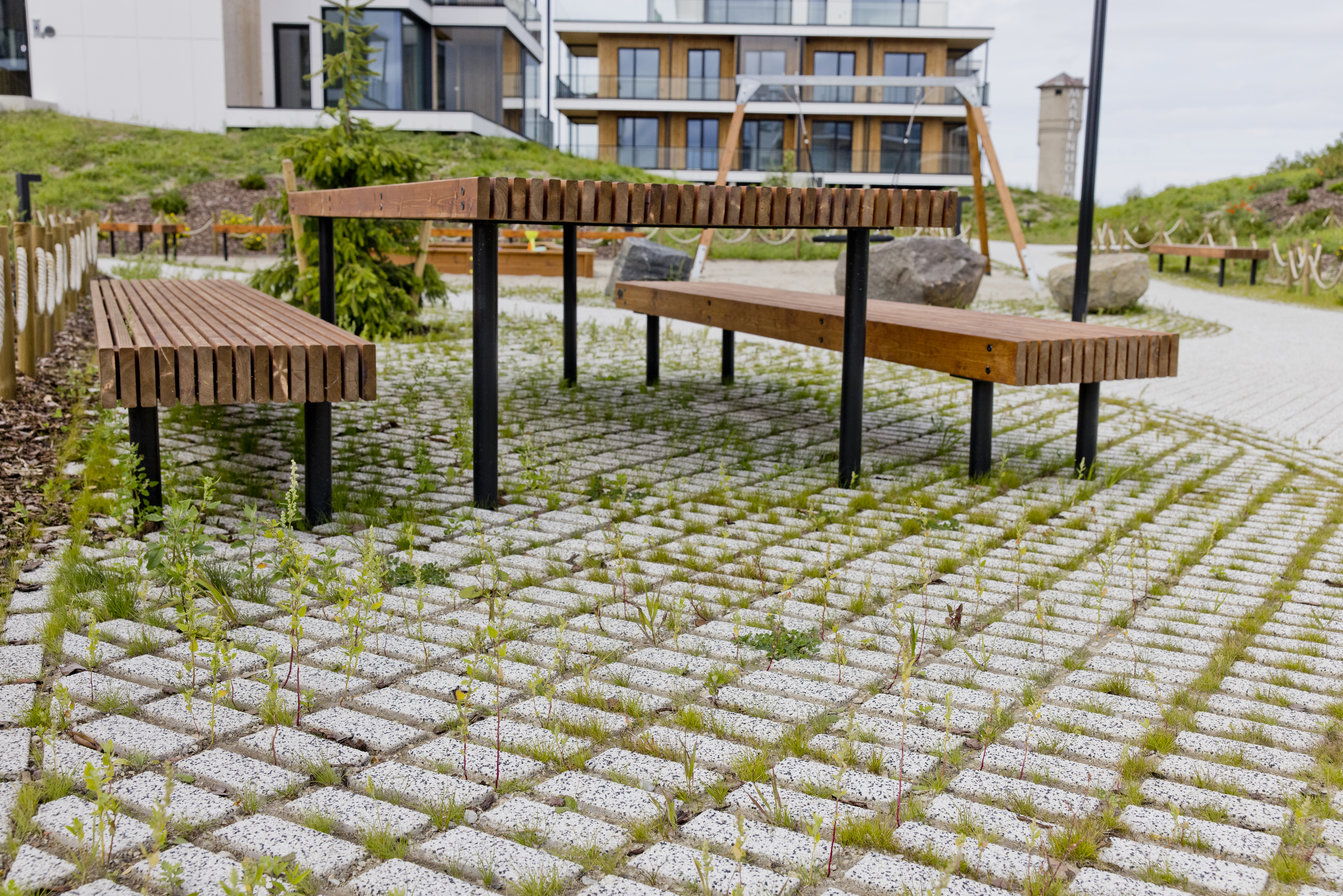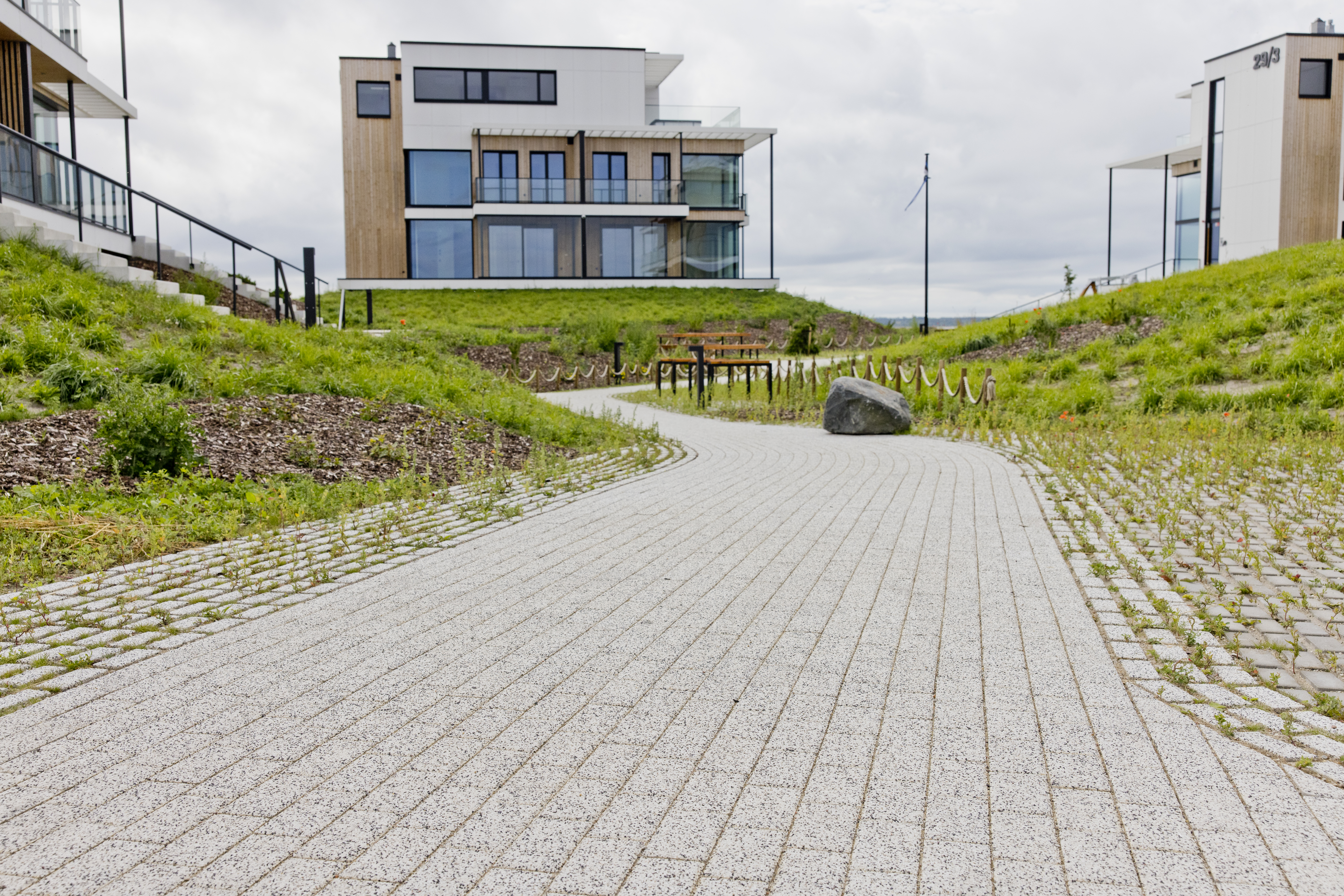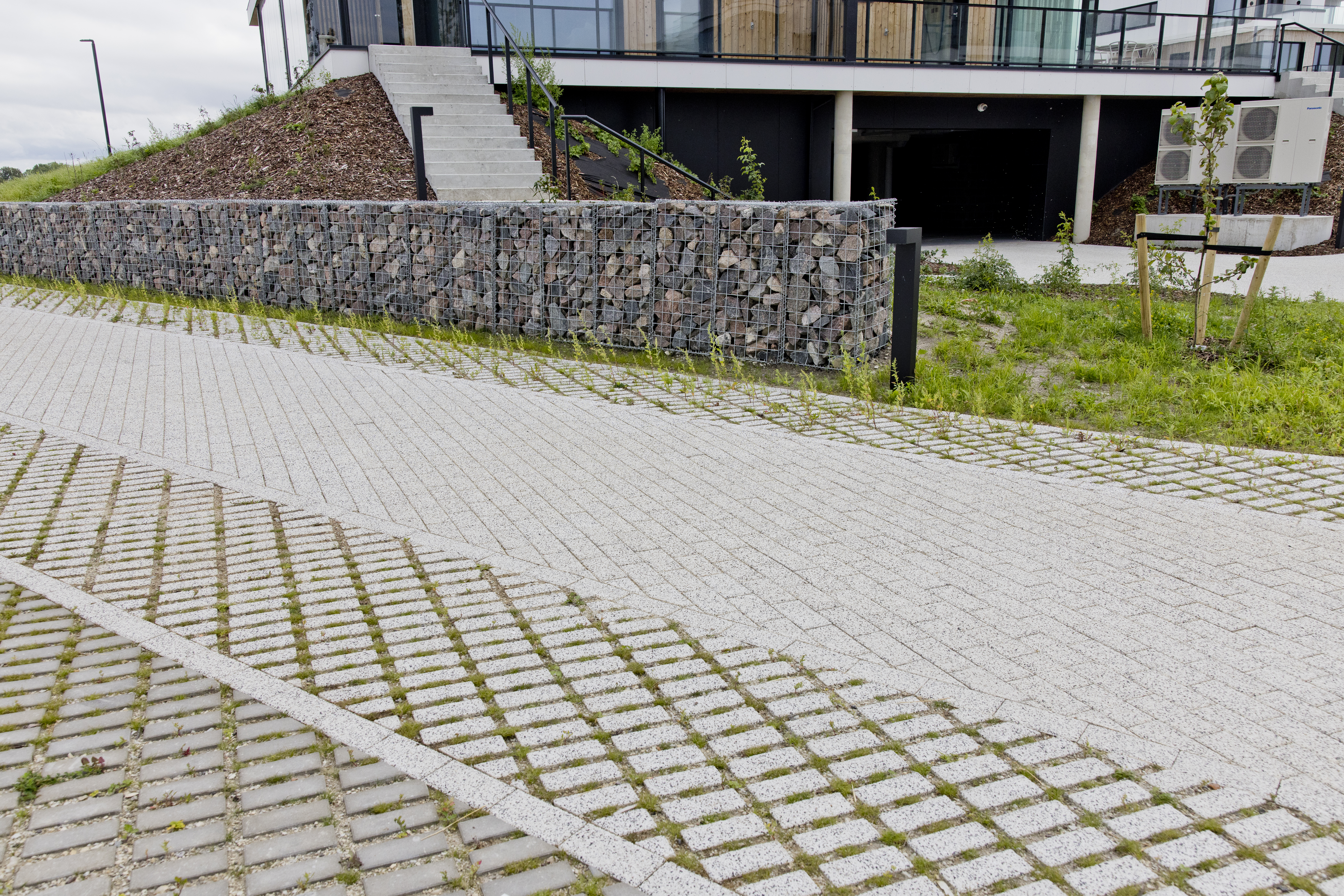 Izcili, ka projektam, kura platība pārsniedz 2000 m2 izvēlēti tikai divi produkti un tikai divas faktūras – tie ir Eco Line un Prizma 8 izstrādājumi, kas pārklāti ar Quartz dabīgā akmens faktūru un ir dabīgi pelēkā krāsā. Produkti izmantoti taku, kopējo laukumu, atpūtas un bērnu rotaļu zonu veidošanai. Eco Line produkti veido stāvvietu zonas, velosipēdu novietnes un taku malas. Projekts ir ierīkots piejūras zonā, tāpēc Eco Line produkta atvērtajās vietās ieaug vietējie kāpu augi.