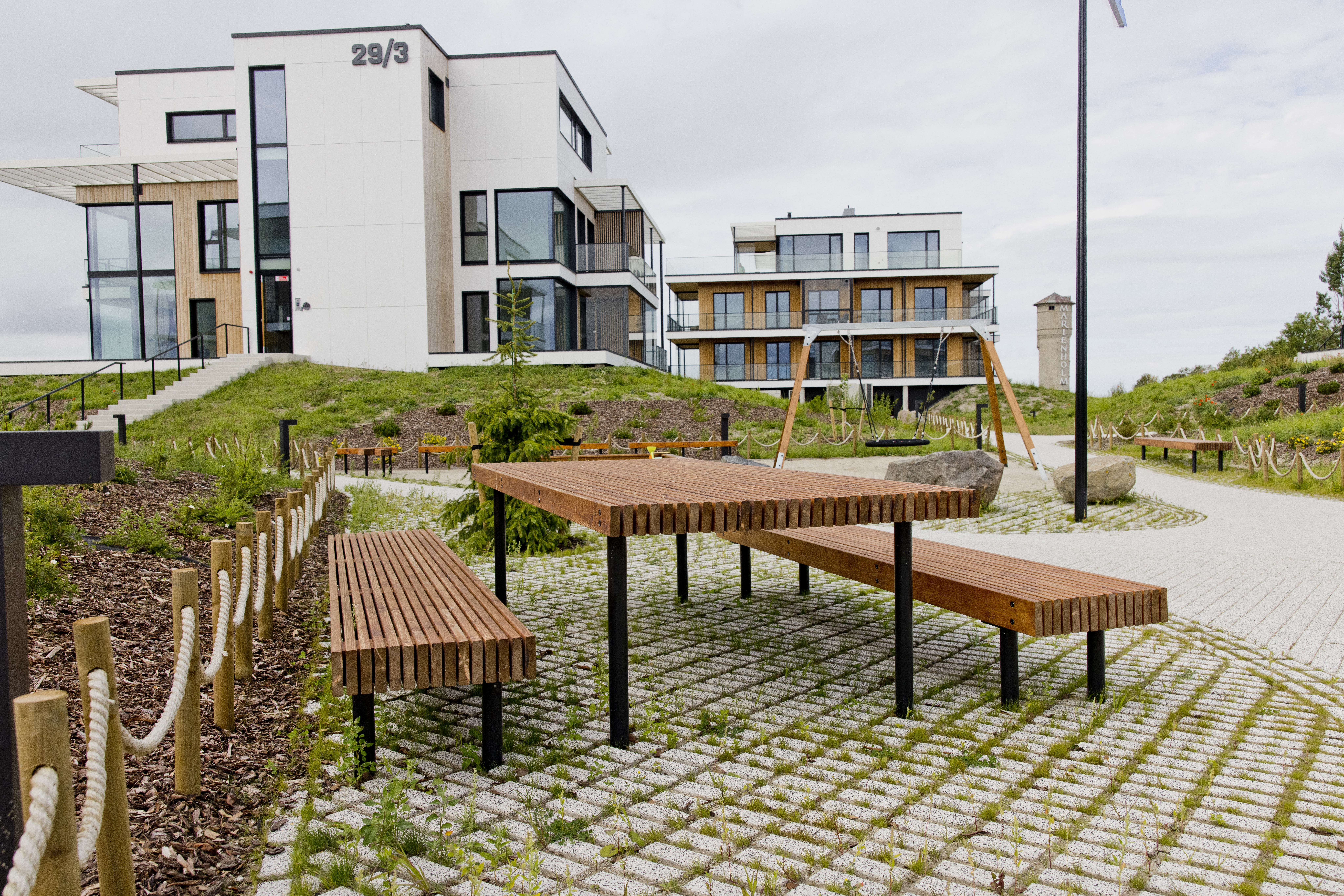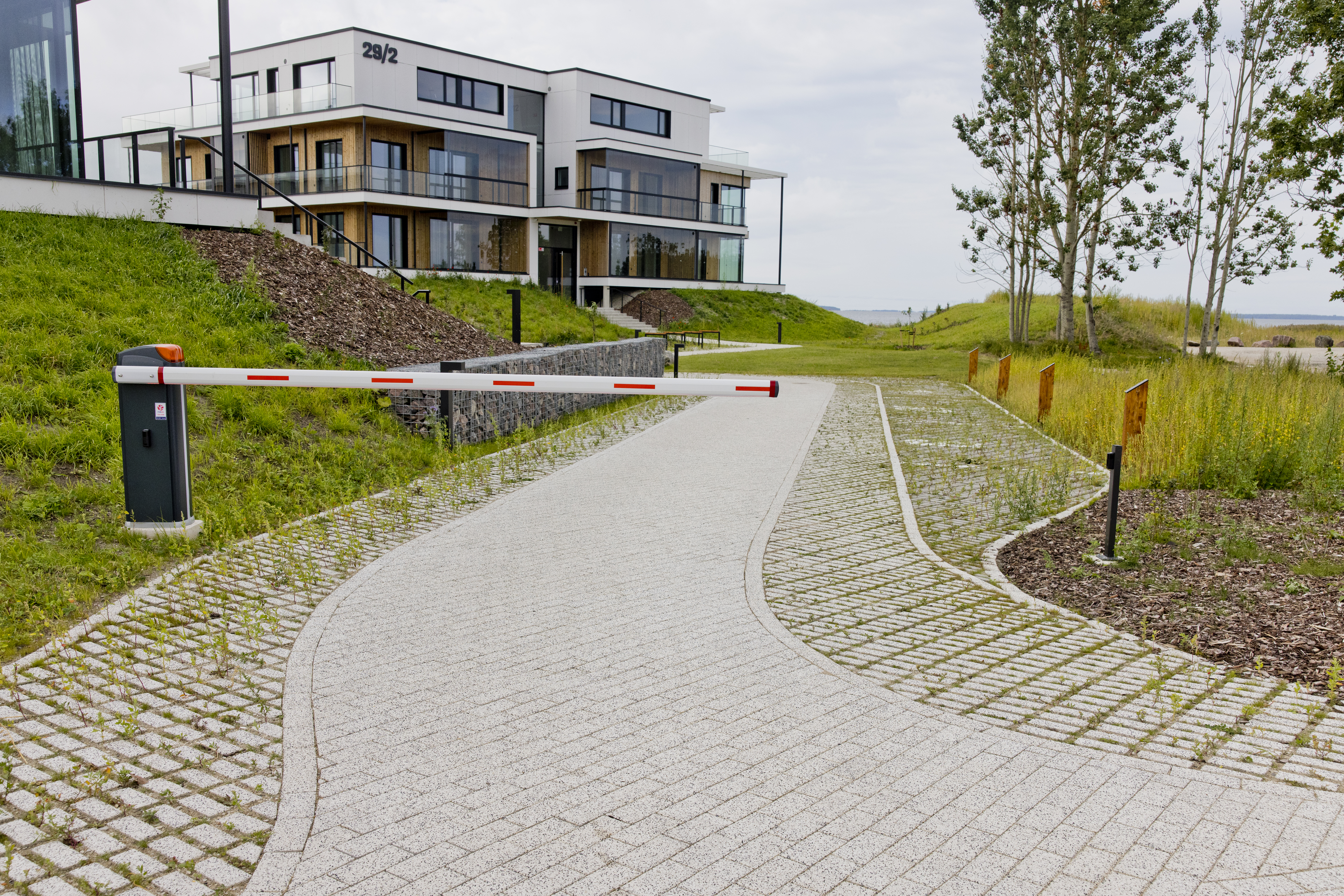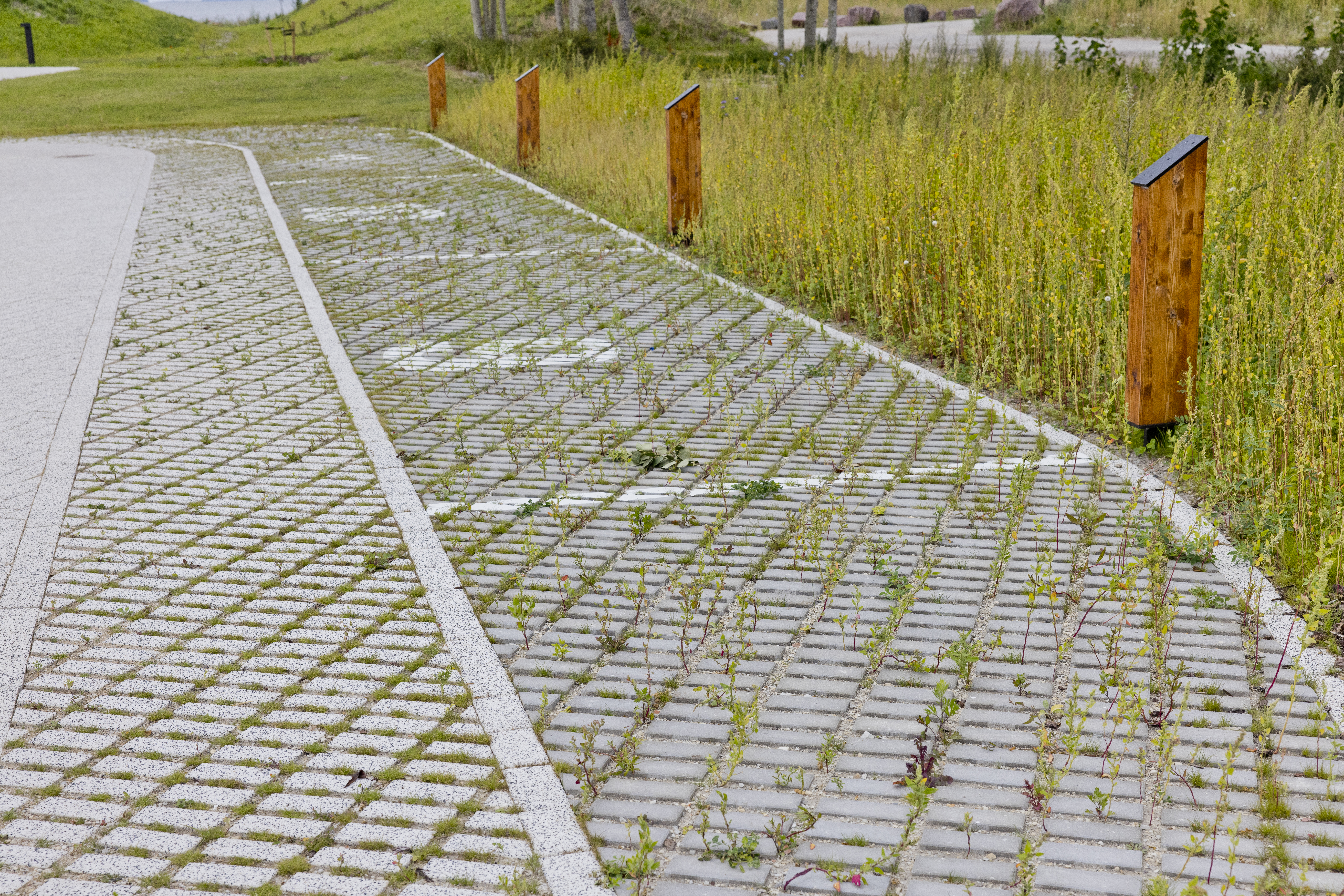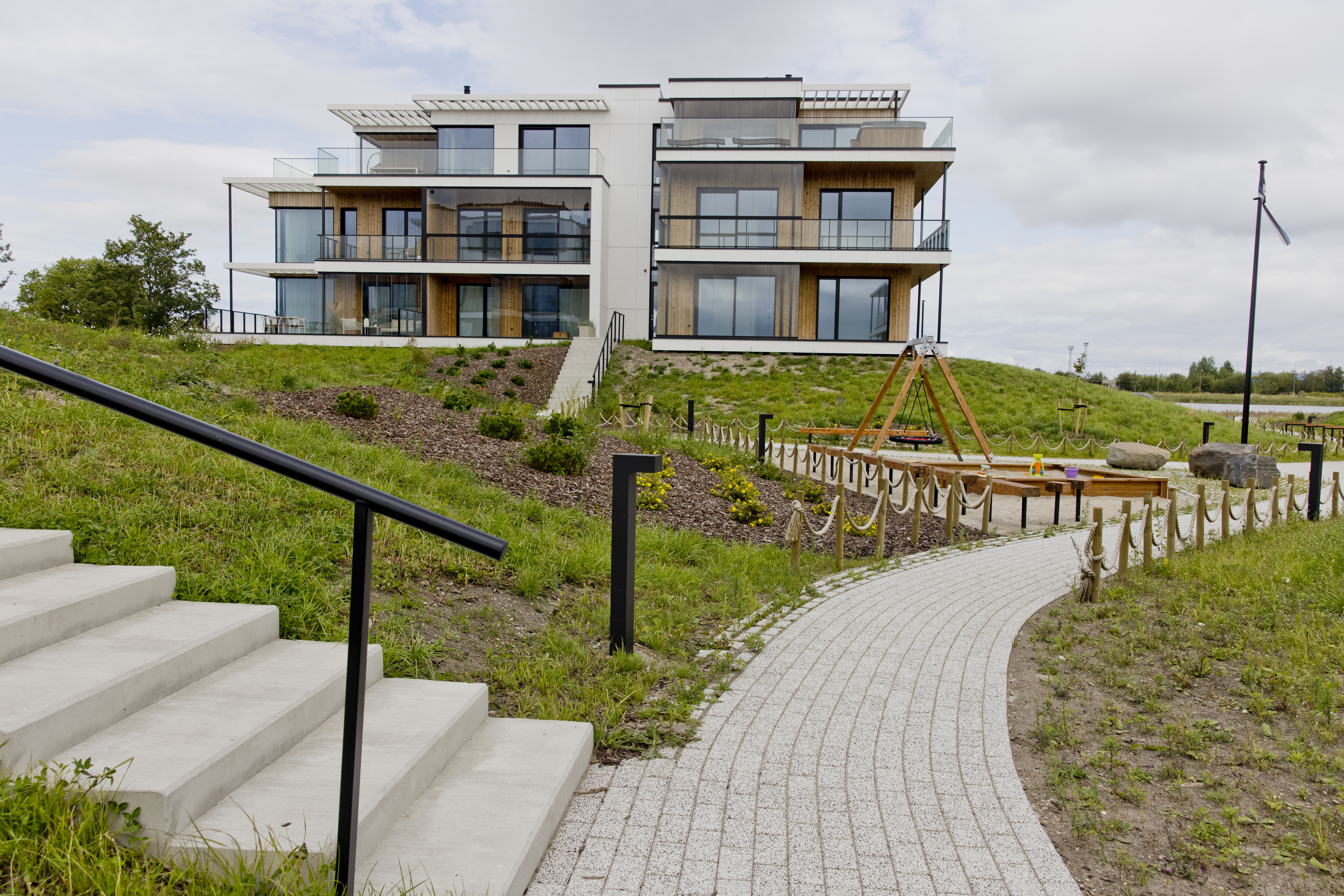 Izcili, ka projektam, kura platība pārsniedz 2000 m2 izvēlēti tikai divi produkti un tikai divas faktūras – tie ir Eco Line un Prizma 8 izstrādājumi, kas pārklāti ar Quartz dabīgā akmens faktūru un ir dabīgi pelēkā krāsā. Produkti izmantoti taku, kopējo laukumu, atpūtas un bērnu rotaļu zonu veidošanai. Eco Line produkti veido stāvvietu zonas, velosipēdu novietnes un taku malas. Projekts ir ierīkots piejūras zonā, tāpēc Eco Line produkta atvērtajās vietās ieaug vietējie kāpu augi.