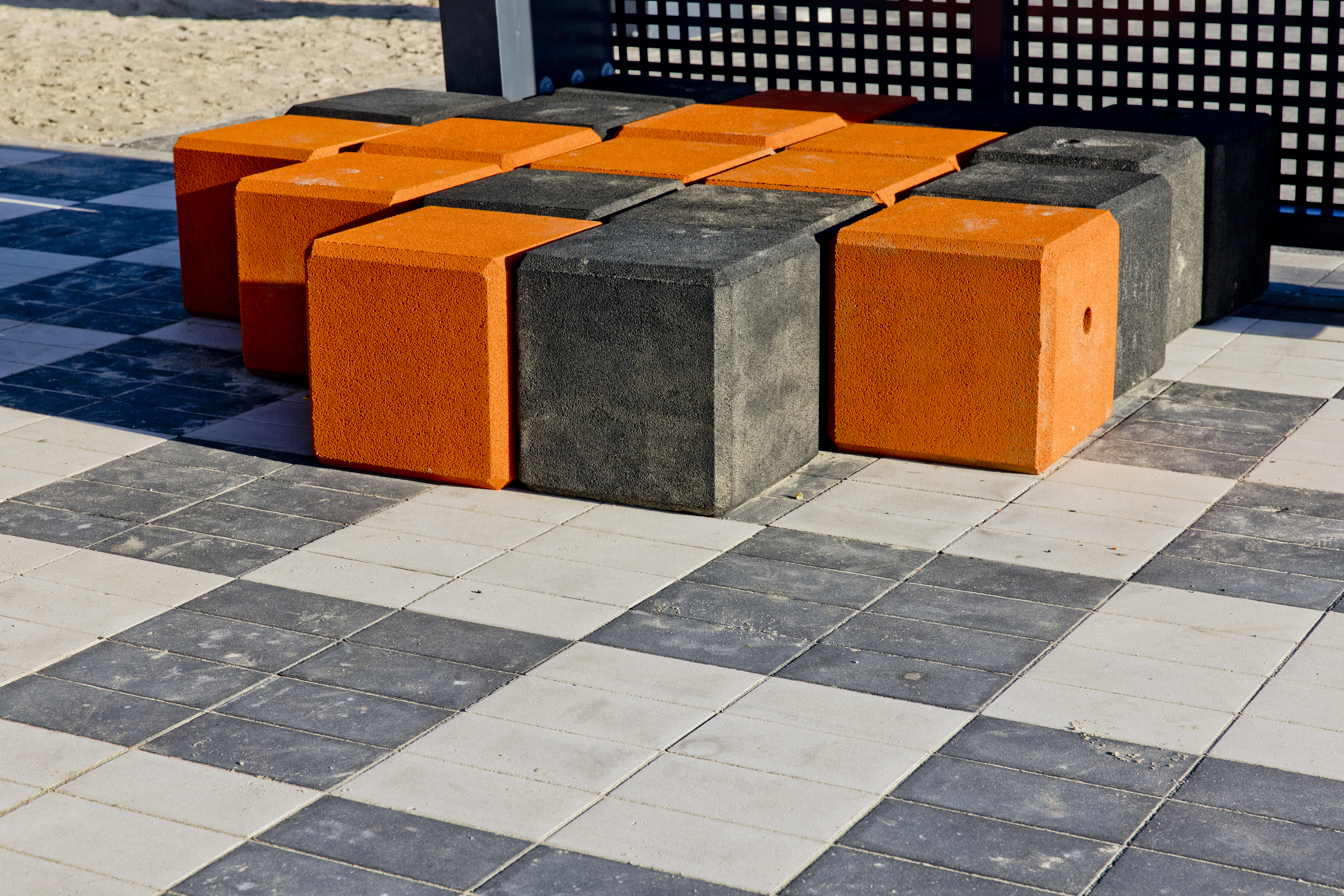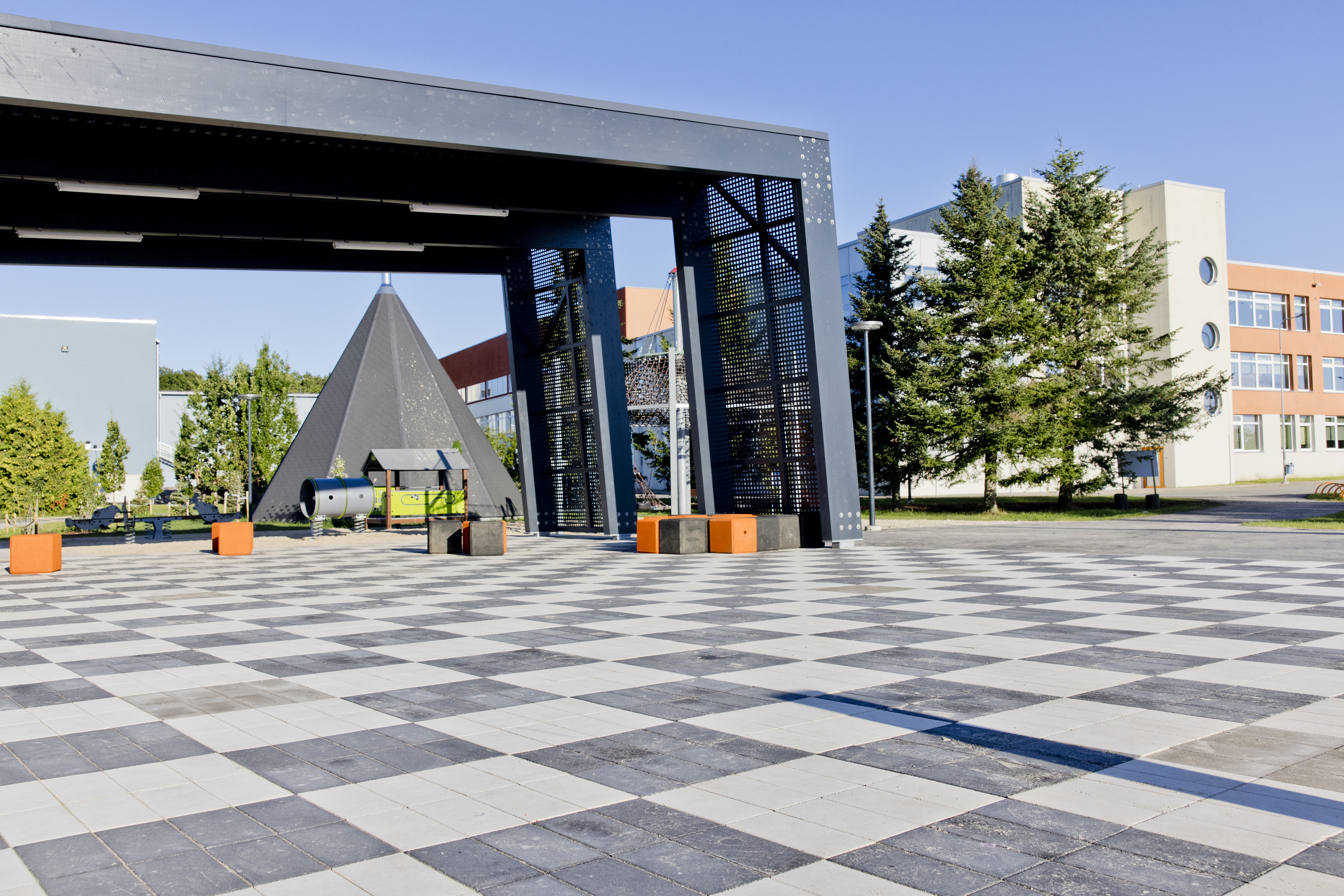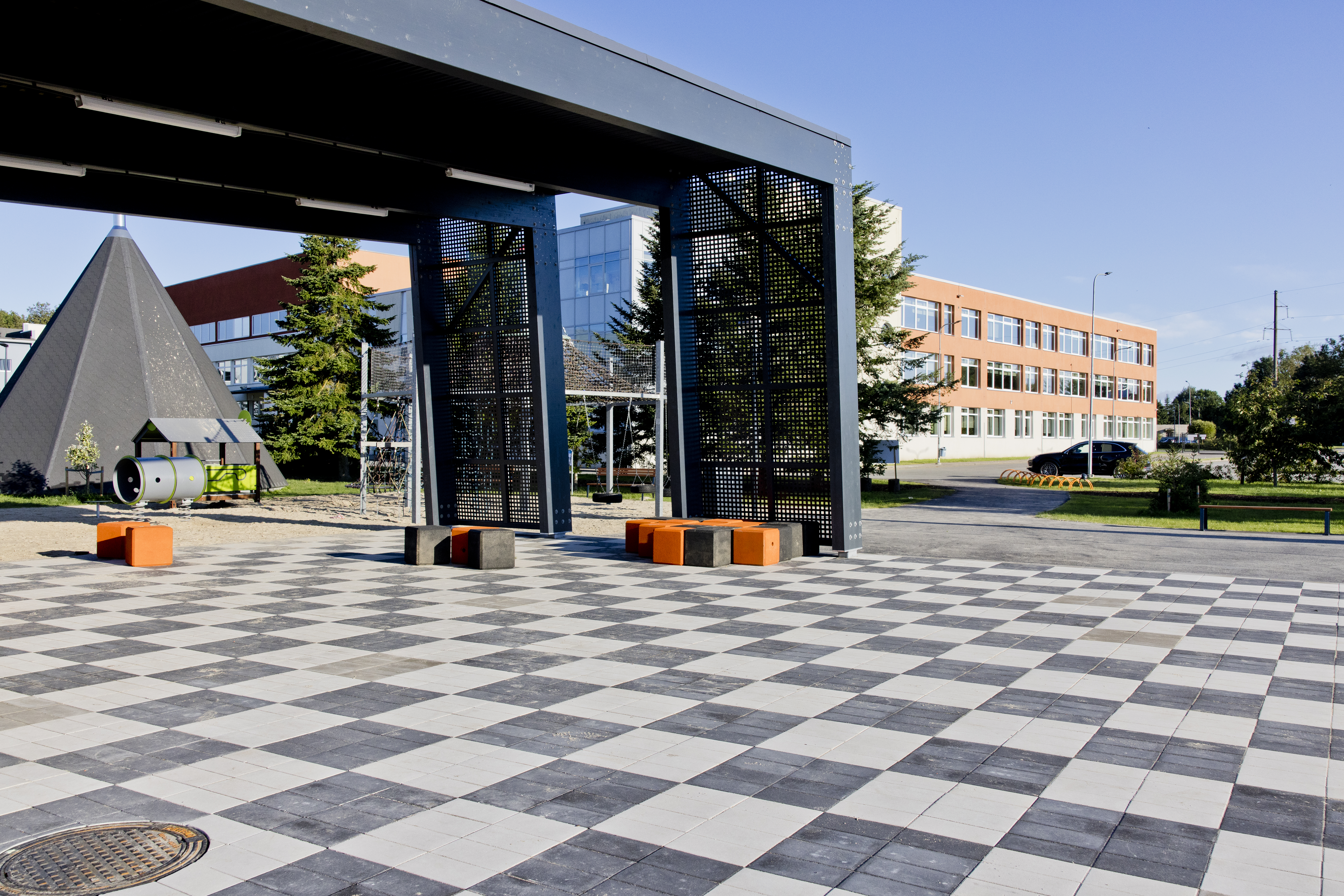 Vēl viens projekts Igaunijā – nelielas pilsētiņas skolas stadions. Droši vien nepārsteigsim, sakot, ka projektā izmantoti balti, melni un dabīgā betona krāsas izstrādājumi. Tomēr krāsainā apkārtne un jo īpaši detaļas rada ļoti iespaidīgu telpu. Kā jau minējām Torvandi projektā – skolu videi bieži tiek piemēroti skandināvu labiekārtošanas principi: gaišas krāsas, kontrasts, ilgtspēja un nereti arī nokrišņu ūdens drenēšanas risinājumi.